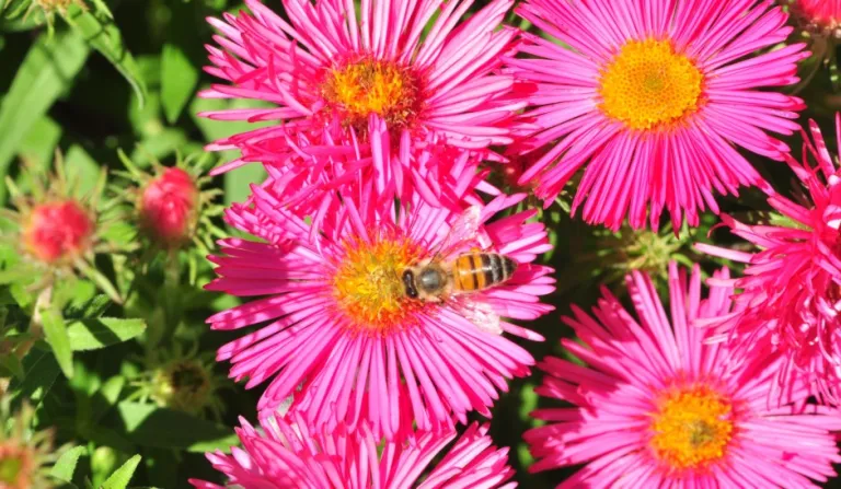 Description: Les asters d’automne sont des plantes vivaces herbacées de culture très facile et qui s’adaptent à la plupart des sols sans excès. Leur hauteur varie énormément en fonction des cultivars et des géniteurs. Les descendants d’Aster novi-belgii sont généralement plus petits que ceux issus d’Aster novae-angliae. Parmi les hybrides, il existe des variétés naines idéales pour les bordures, des variétés moyennes pour les premiers plans des massifs de vivaces et des variétés de grande taille pour l’arrière-plan des mixed-border. En moyenne, la hauteur se situe aux alentours de 1,2 m. Un autre caractère distingue les deux principaux géniteurs. Il concerne la pilosité des feuilles. L’aster de la Nouvelle-Belgique (également appelé aster de Virginie) possède des feuilles lisses ou glabres tandis que l’aster de la Nouvelle-Angleterre est à feuilles très nettement pubescentes. Leur floraison en capitules de type radié s’effectue en septembre-octobre d’où le nom de marguerite de la StMichel (ce saint est fêté le 29 septembre). Les abeilles butinent activement les fleurs du disque central, jaune orangé, où elles récoltent du nectar et du pollen. De nombreux akènes munis d’une aigrette soyeuse succèdent aux fleurs. Ils seront disséminés par le vent et parfois seront à l’origine d’une début de naturalisation voire d’invasion de l’espèce.
