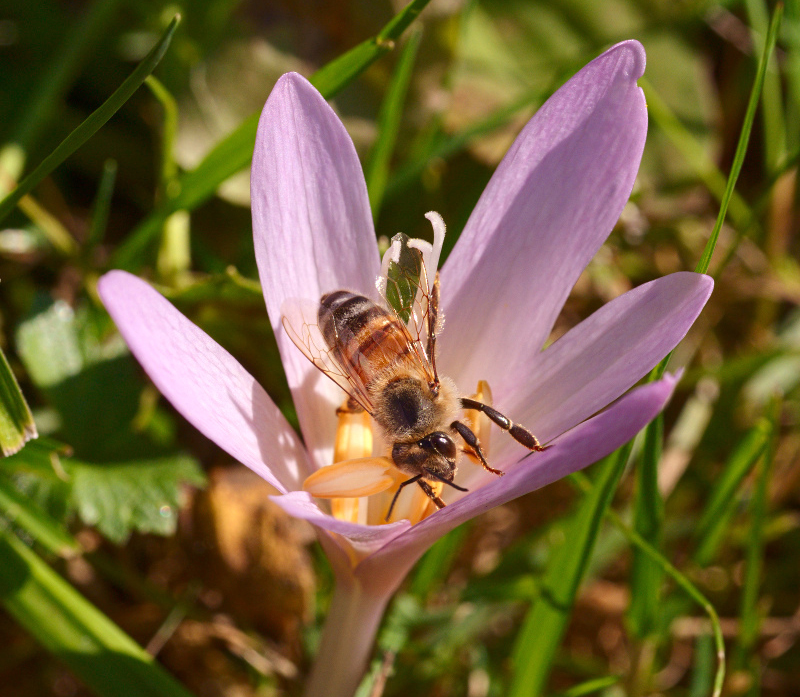 Le saviez-vous ? La colchicine est l’alcaloïde très toxique que contiennent toutes les parties de la plante. A faible dose, ce poison est utilisé dans le traitement spécifique de la goutte, maladie chronique du métabolisme de l’acide urique. En biologie, la colchicine est utilisée pour contrarier la division cellulaire et obtenir des plantes polyploïdes c’est-à-dire dont le nombre des chromosomes est multiplié par 2, 4 et plus. Elles sont généralement plus grosses et plus productives. Lorsqu’on observe les abeilles butiner des fleurs de colchique on les voit récolter du pollen directement au niveau des anthères, du nectar au fond de la coupe florale mais aussi lécher les tépales. Dans le langage des fleurs, le colchique d’automne est le symbole de la jalousie