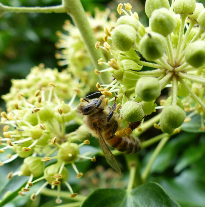 Les feuilles à la base du lierre sont larges et peu profondément lobées, celles au milieu sont grandes et en forme de cœur, dentelées légèrement sur le bord, et celles en haut des tiges sont plus petites et allongées. En fin d’été, ces tiges aériennes produisent des fleurs verdâtres regroupées en grosses grappes nourrissant de nombreux insectes et petits animaux grâce à leur nectar abondant. Après pollinisation, ces fleurs se transforment en petites baies noires appréciées par les oiseaux qui disséminent les graines alentour. Le lierre de Colchide embellit avec élégance les espaces en sol frais et dissimule efficacement des éléments disgracieux tels que des constructions laides ou des conifères en décomposition dans une haie monotone.